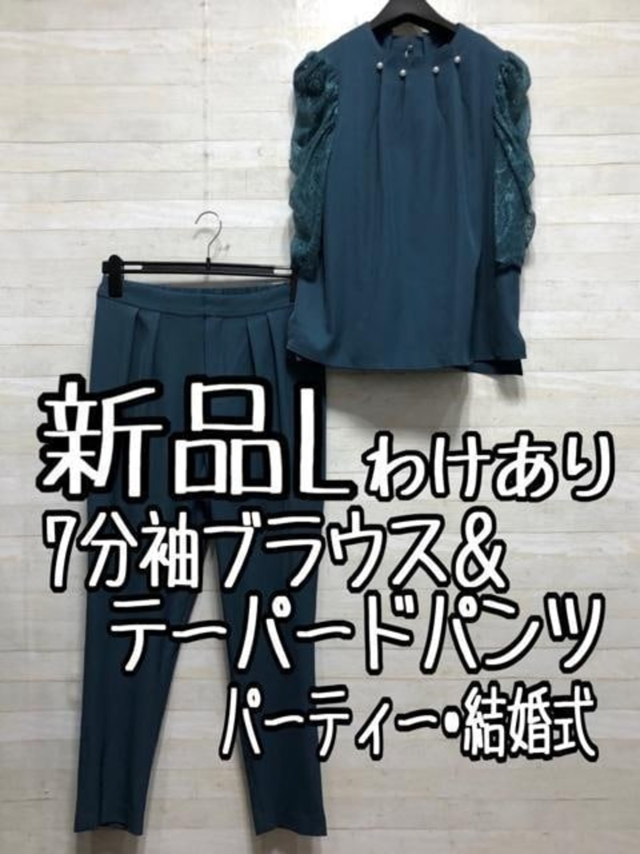 新品☆L♪パール調ネックブラウス&パンツ上品セットアップ♪わけあり☆A196