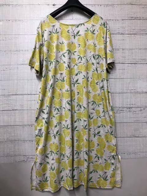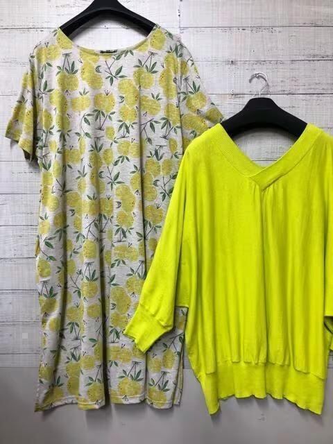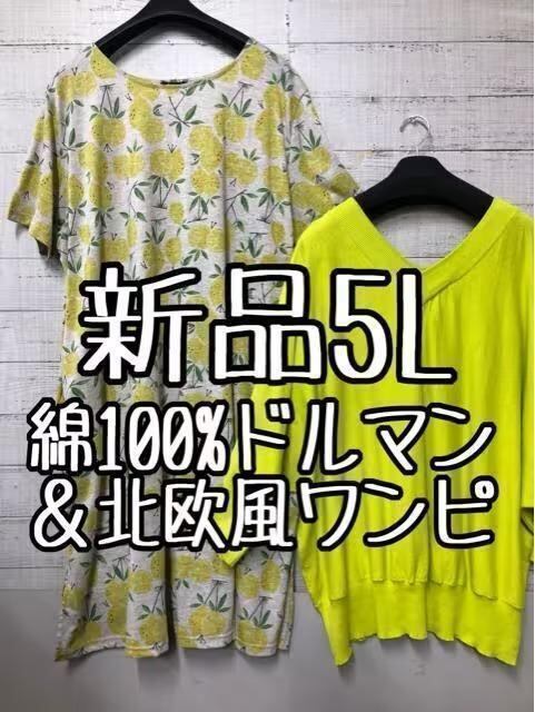 新品☆5L♪イエロー系ゆったり綿ニット&北欧風レモン柄ワンピース♪☆s635