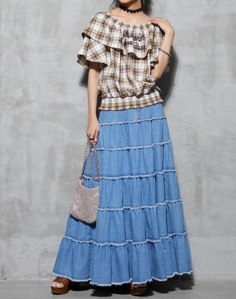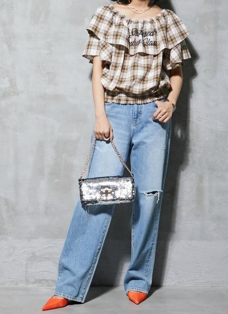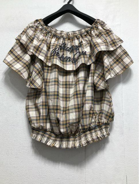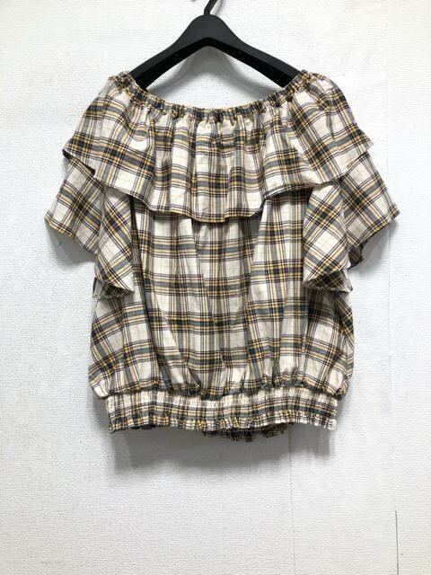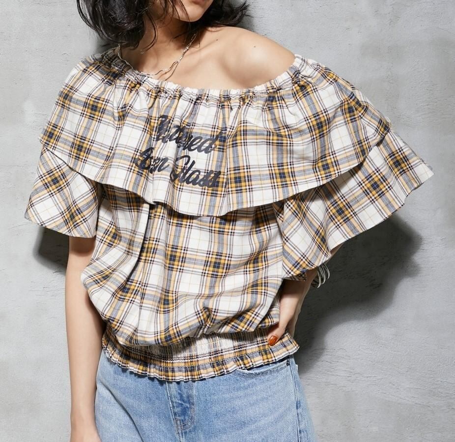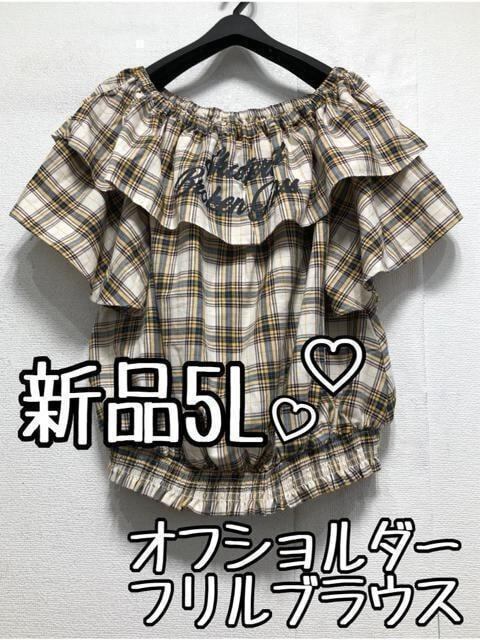 新品☆5L♪イエロー系チェック柄♪オフショルフリルブラウス♪☆b857