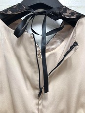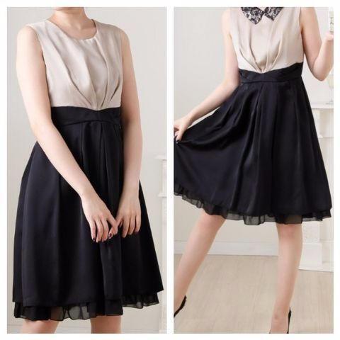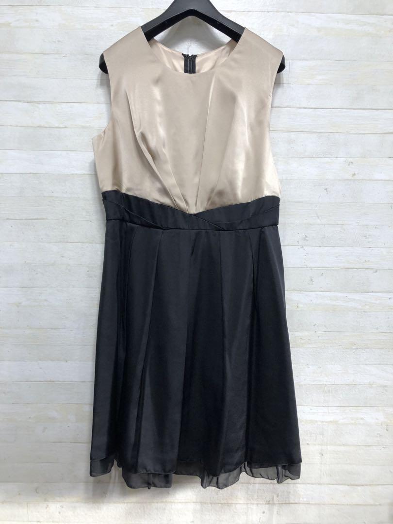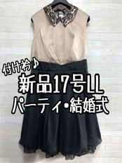 新品☆17号LLベージュ×黒系サテン素材のパーティワンピース♪つけ衿付〇G496