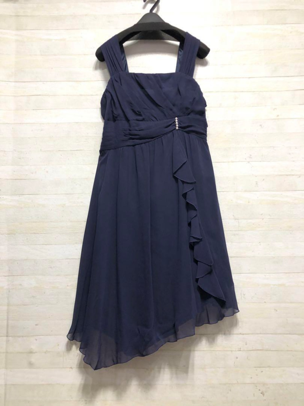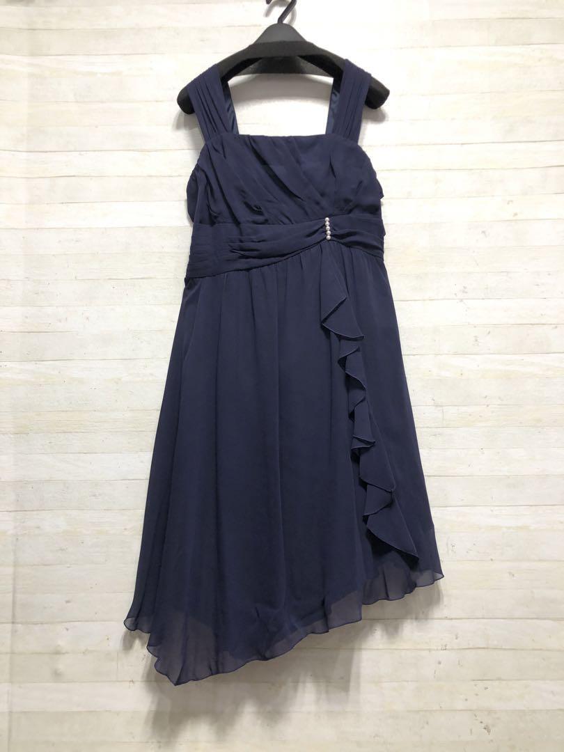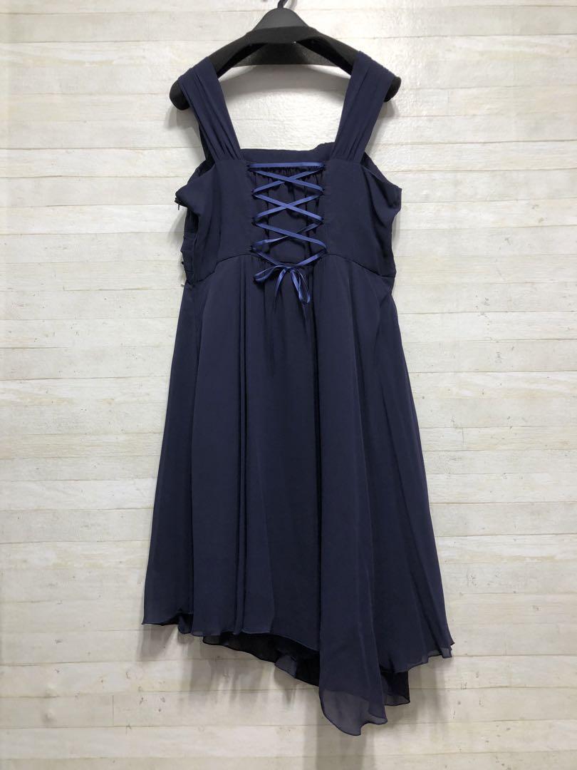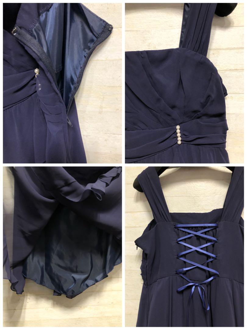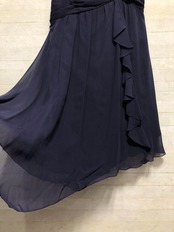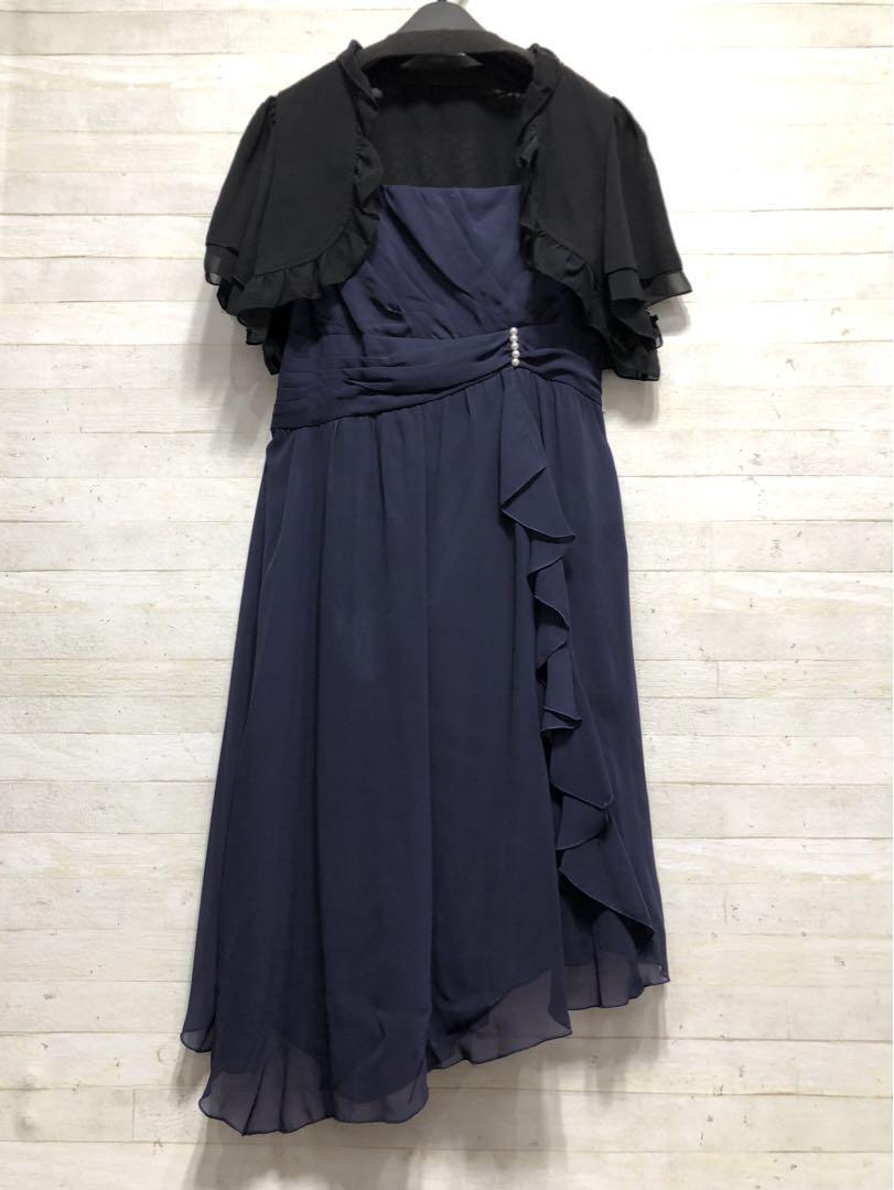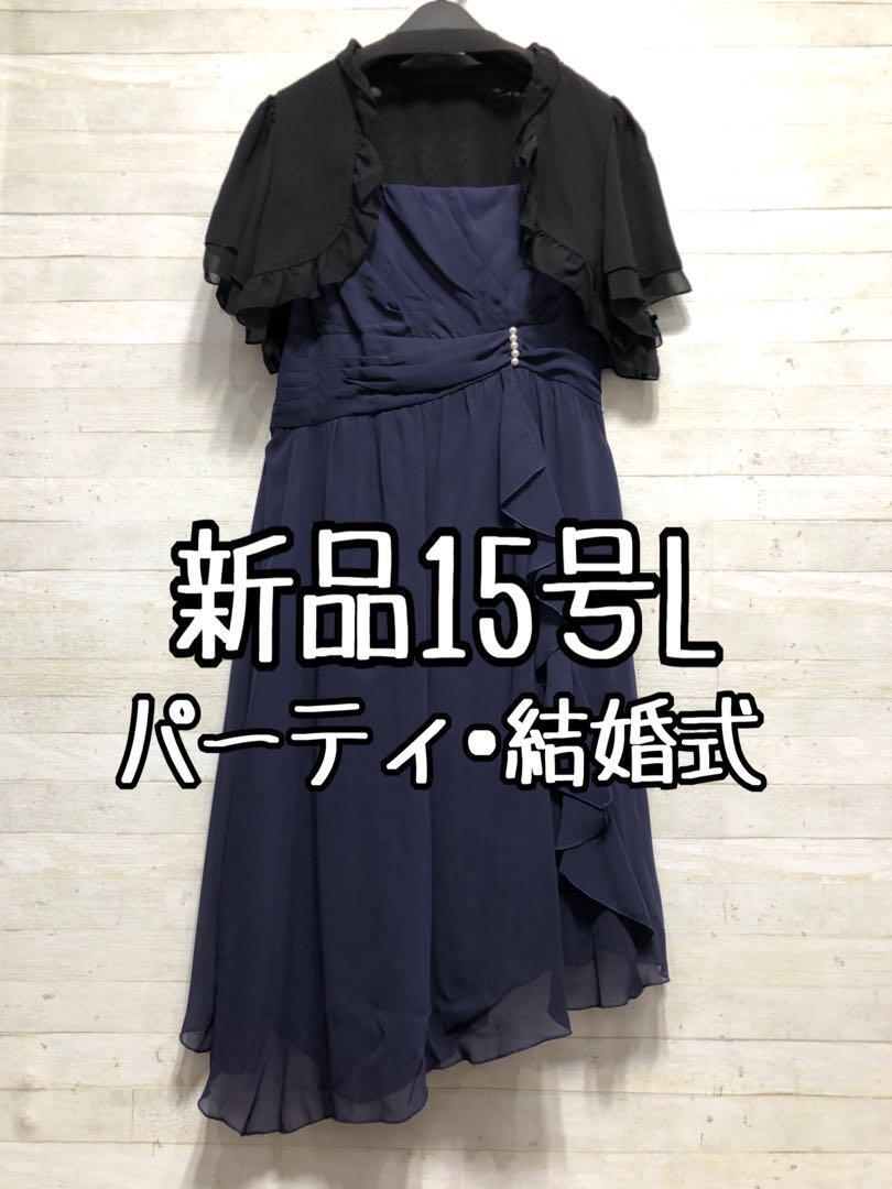 新品☆15号L紺系♪長め丈裾シフォンパーティーワンピース〇D653