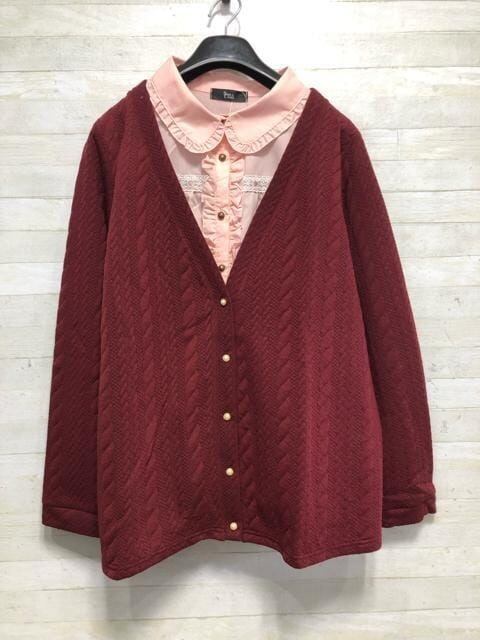 フリルシャツ×カーディガンの重ね着風トップス