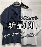 新品☆10L♪リボンボウタイ&レース袖♪きれいめブラウス2枚セット☆L364