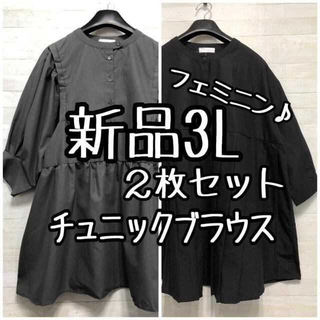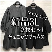 新品☆3L♪黒・グレー♪フェミニンブラウス・チュニック2枚セット♪☆D743