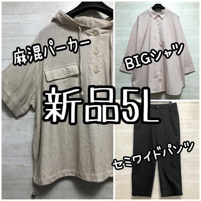 新品☆5L♪麻混パーカーシャツ・ビッグシャツ・セミワイドパンツ☆D822
