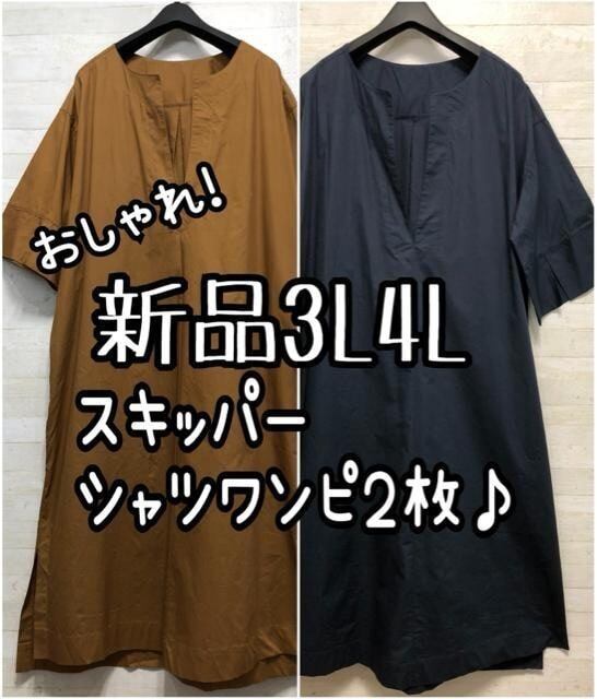 新品☆3L4L♪紺モカ♪おしゃれスキッパーシャツワンピース2枚セット☆D885