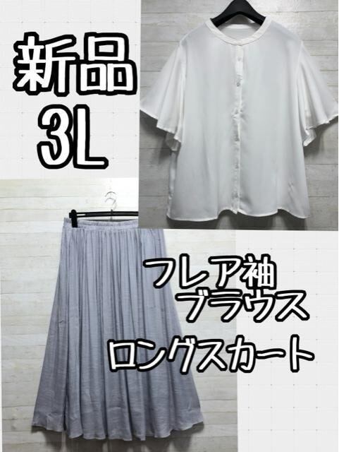 新品☆3L♪白系♪袖フレアブラウス&シアーロングスカート♪フェミニン☆D915