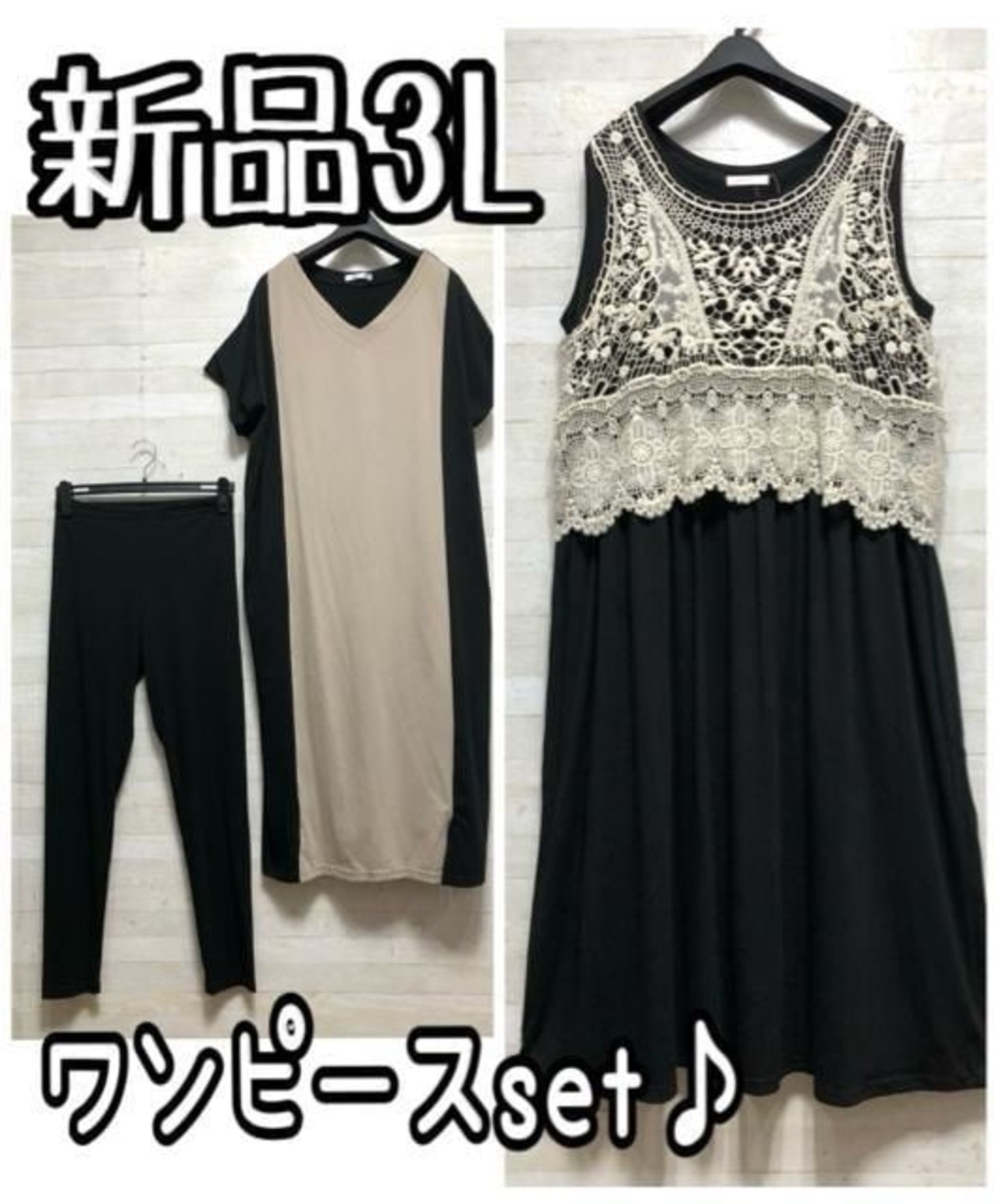 新品☆3L♪黒系♪レギンス付Tシャツワンピ&レースベスト付ワンピ♪☆D962