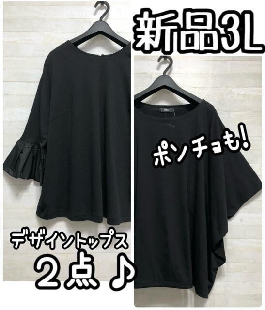新品☆3L♪黒♪おしゃれデザイントップス2枚セット♪ポンチョも☆D991