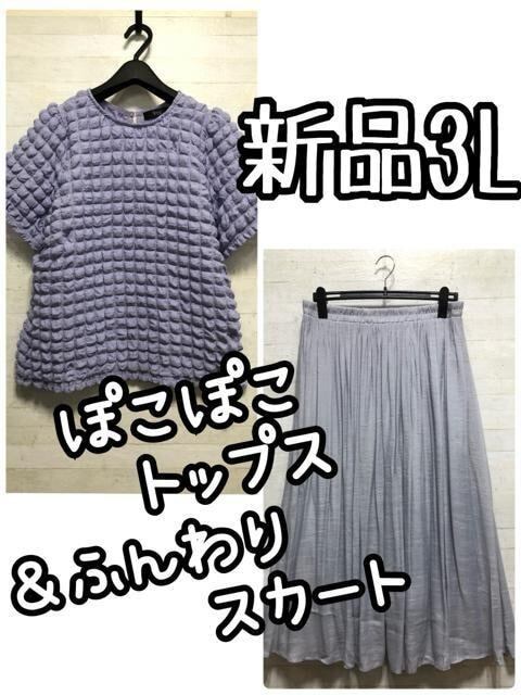 新品☆3L♪パープル系♪ぽこぽこトップス&ふんわりロングスカート♪☆D997