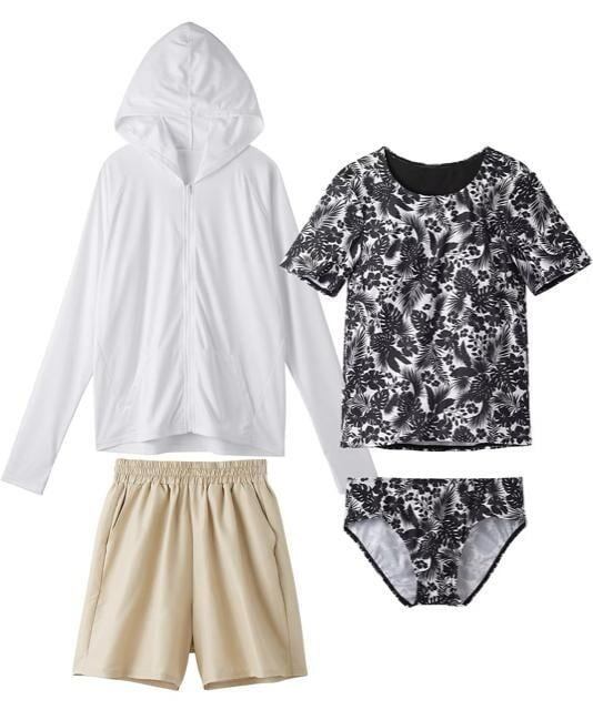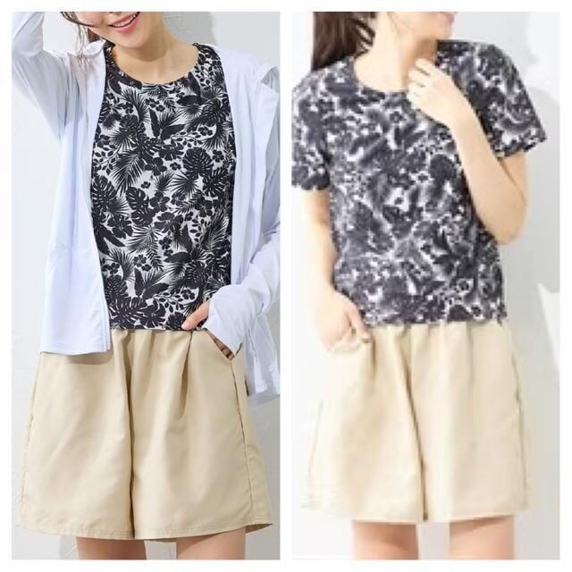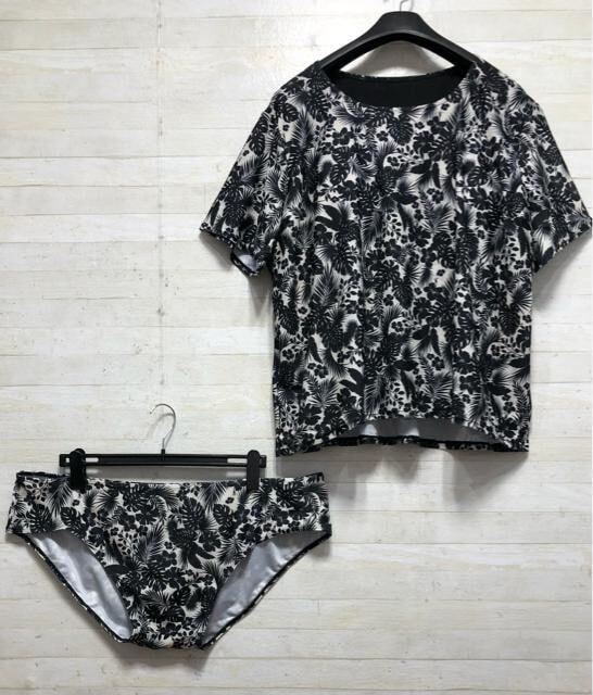 ・半袖タンキニ上下(バストカップ取り外し可):黒系花柄