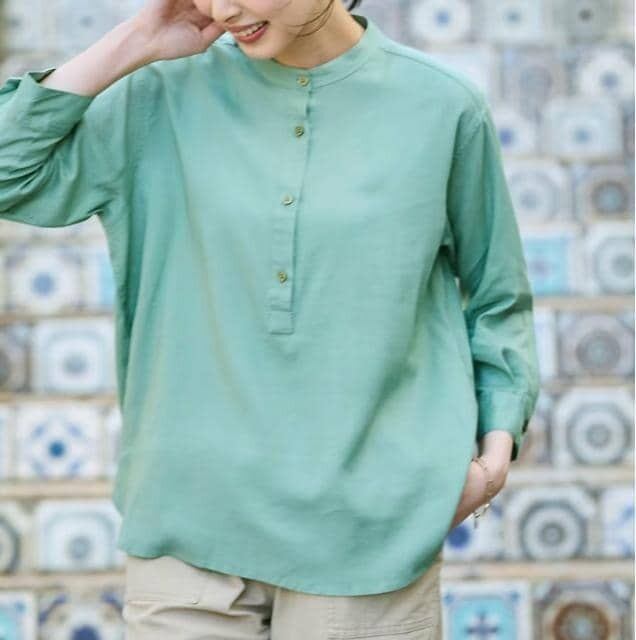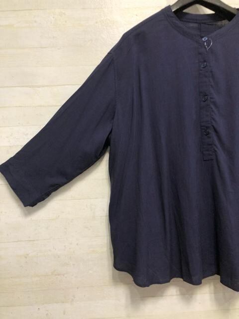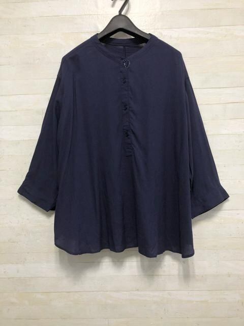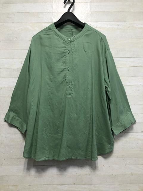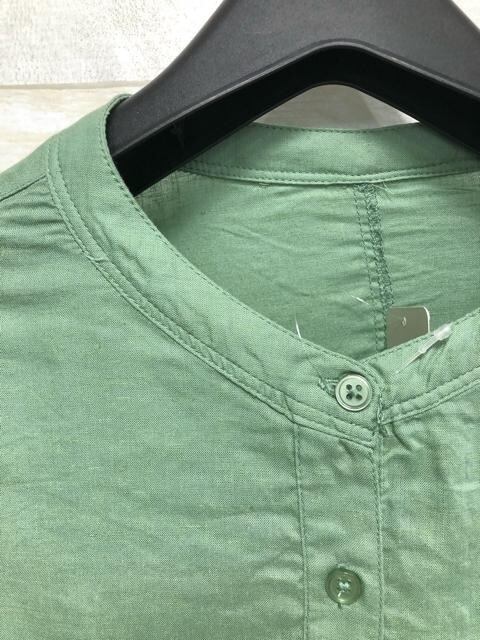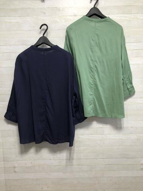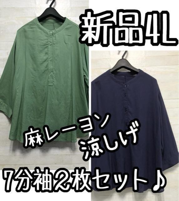 新品☆4L♪紺グリーン系♪レーヨン麻7分袖ノーカラーブラウス2枚set☆G757