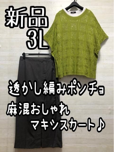 新品☆3L♪透かし編みポンチョ・マキシ麻混おしゃれタイトスカート☆G775