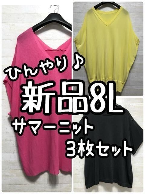 新品☆8L♪黒・ピンク・イエロー♪ひんやりサマーニット3枚♪ドルマン☆G860