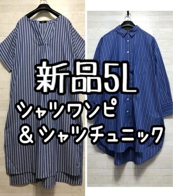 新品☆5L♪ブルー系♪半袖ゆったりワンピース&シャツチュニック♪☆G879