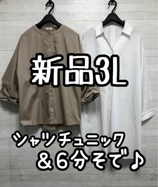 新品☆3L♪白スキッパーシャツチュニック&グレージュ袖クシュシャツG913