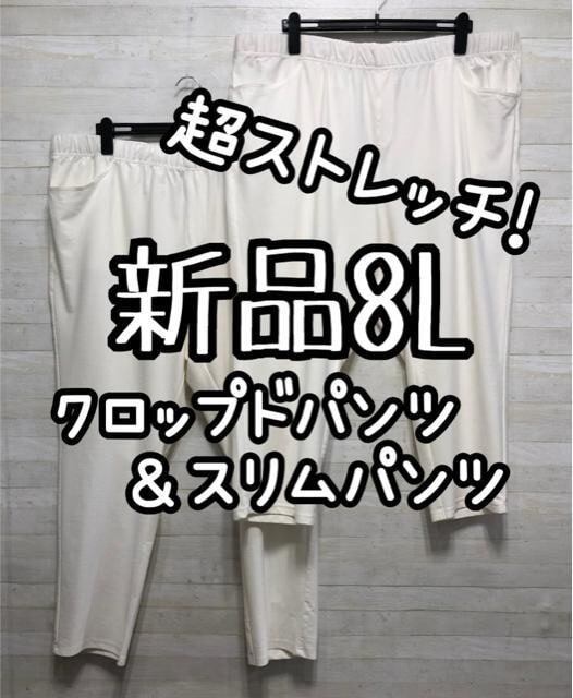 新品☆8L♪白系♪楽ちんストレッチパンツ2種♪クロップド&スリム☆Q249