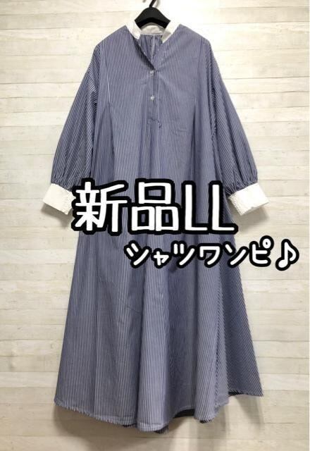 新品☆LL♪ブルー系♪Aラインゆったりシャツワンピース♪マキシ丈☆Q273