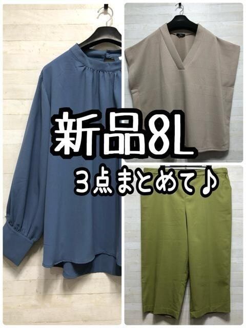 新品☆8L♪きれいめ3点まとめて♪ブラウス・ベスト・グリーンパンツ☆Q313