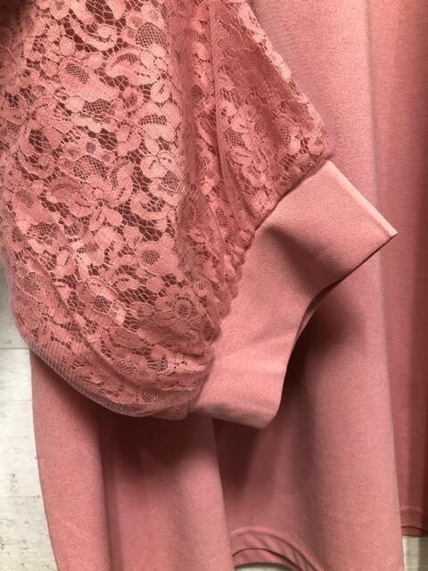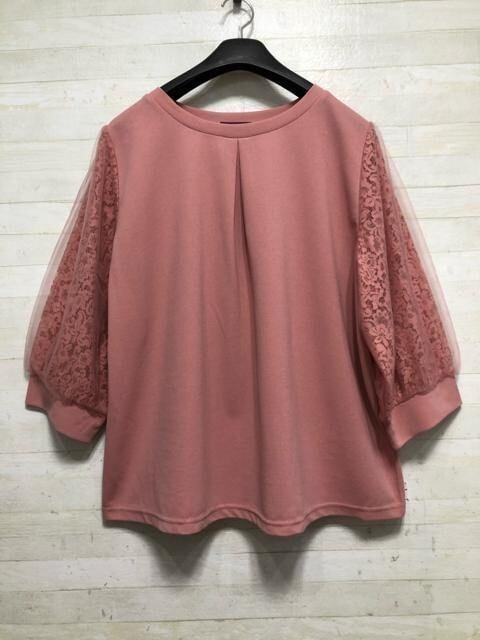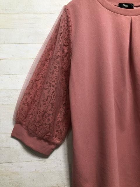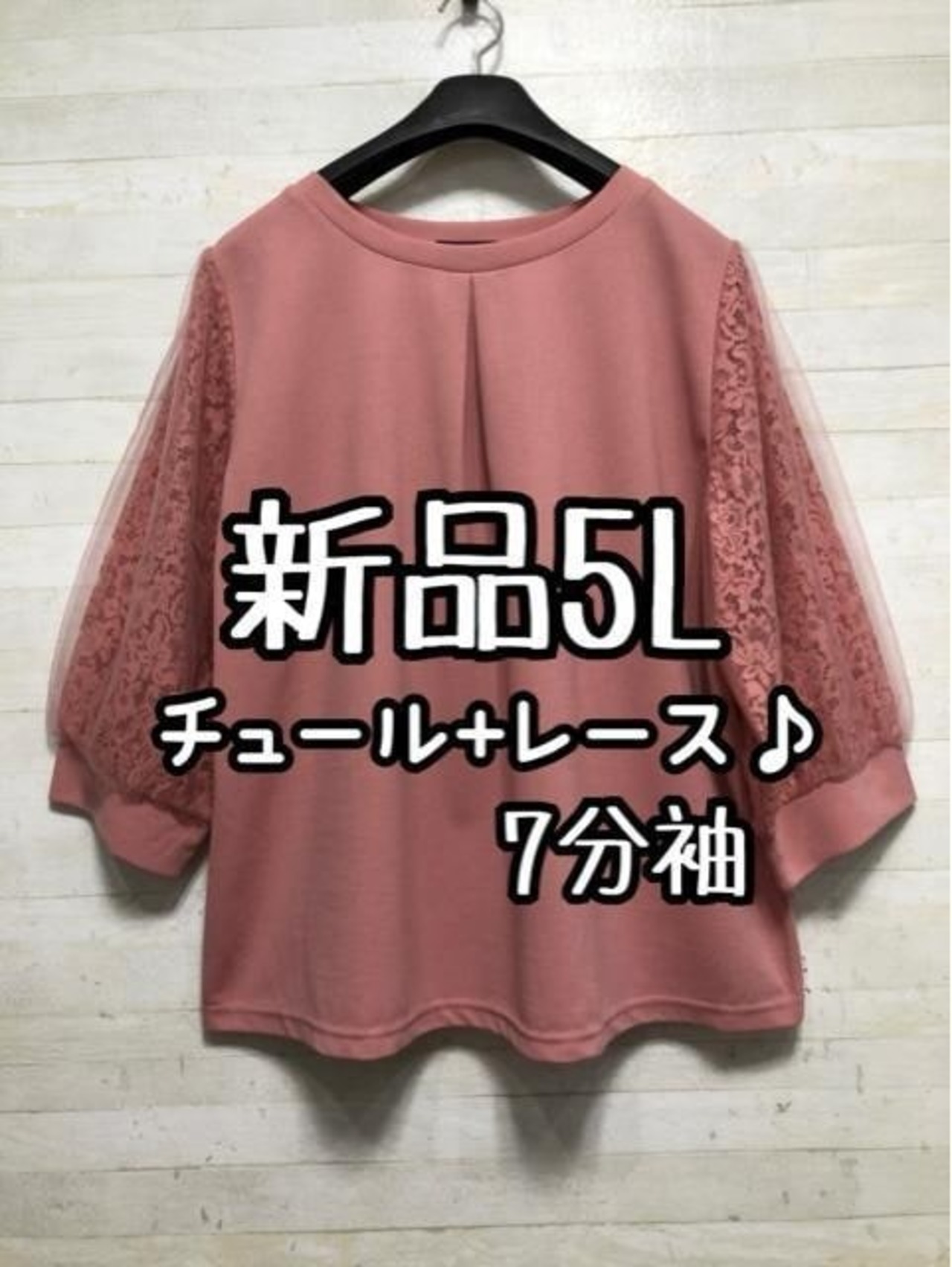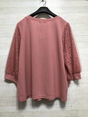 新品☆5L♪ピンク系♪レース+チュール7分袖トップス♪ブラウス☆Q318