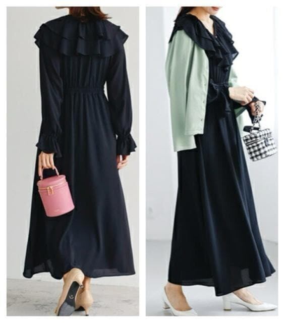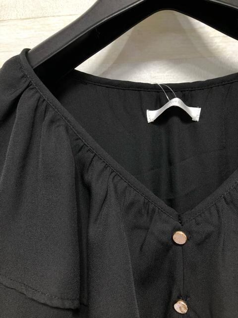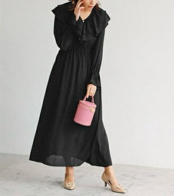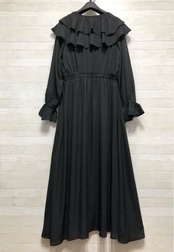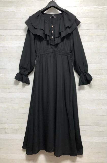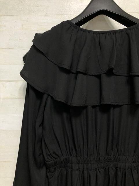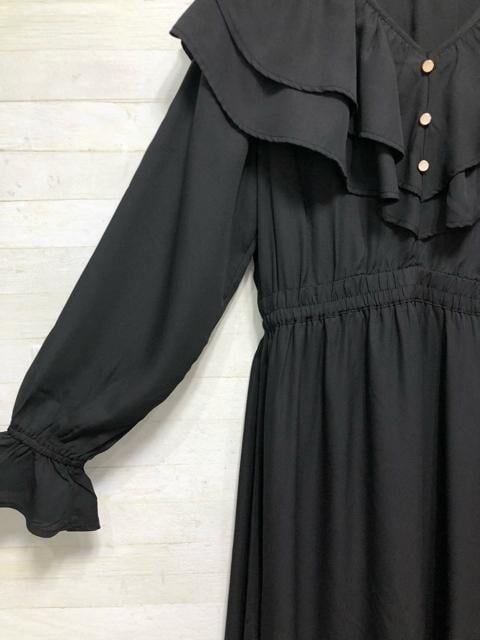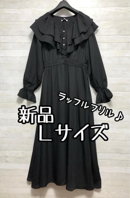 新品☆L♪黒♪ラッフルフリル華やかロングワンピース♪フェミニン☆Q379