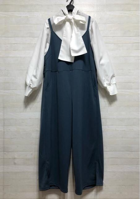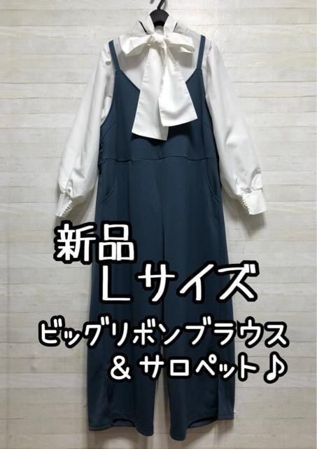 新品☆L♪ビッグリボンのブラウス&ストレッチサロペットパンツ♪☆Q380