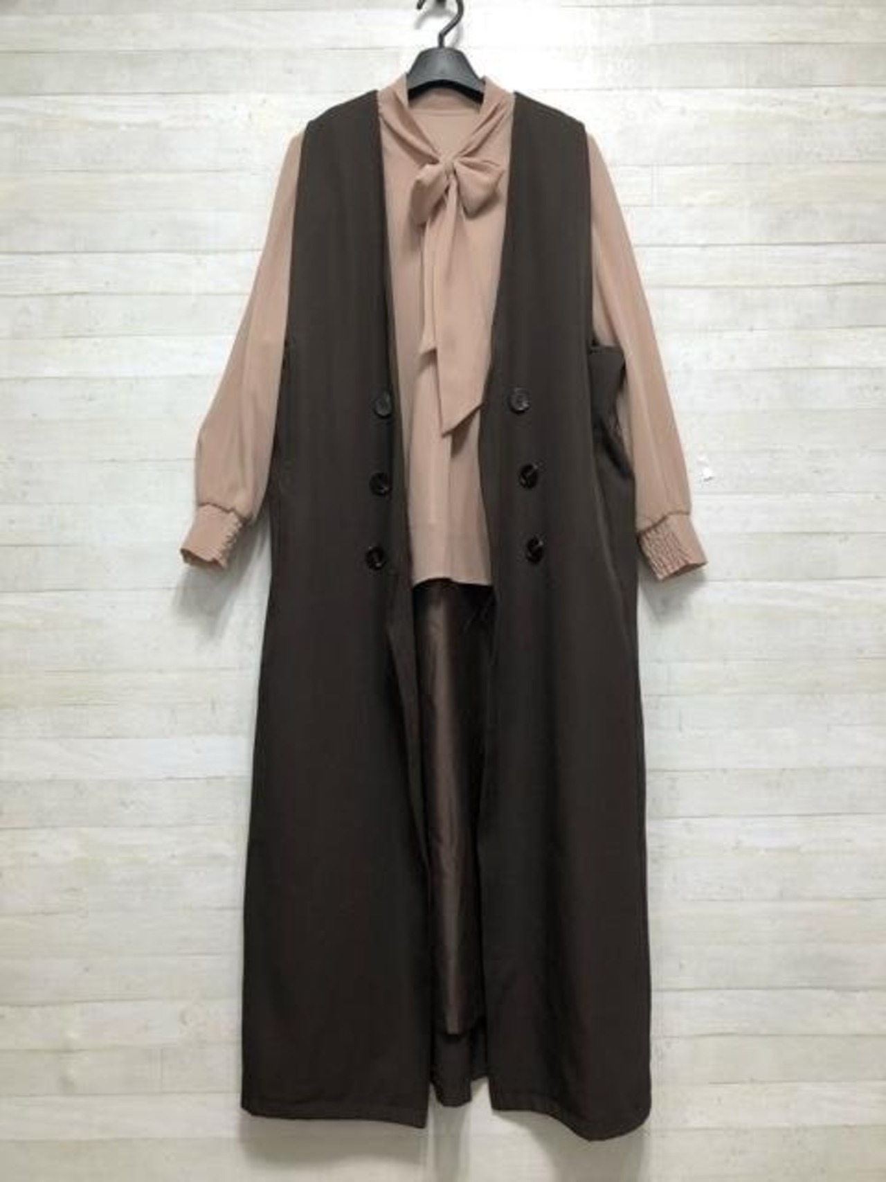 新品☆S♪茶系ジレにもなるジャンスカ&リボンブラウス♪☆Q407