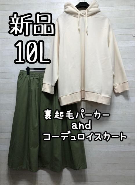 新品☆10L♪裏起毛パーカー&グリーン系コーデュロイロングスカート☆Q536