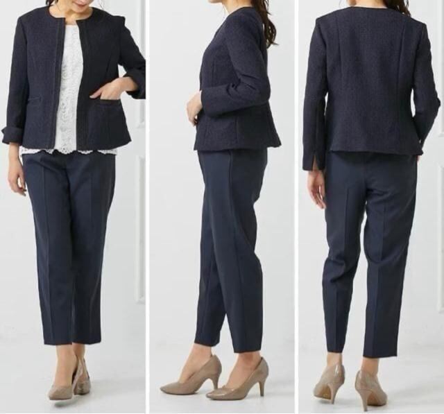 新品☆LL♪紺ツイード調ノーカラージャケットパンツスーツ入卒式も☆R146