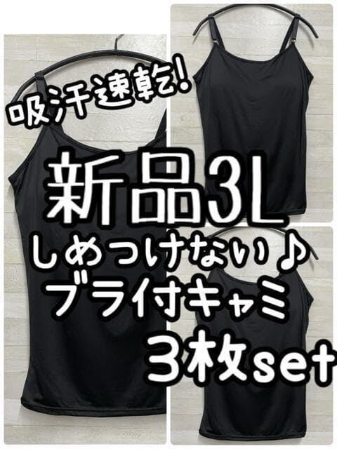 新品☆3L♪しめつけないブラキャミ3枚♪吸水速乾♪ブラトップ黒☆Q650