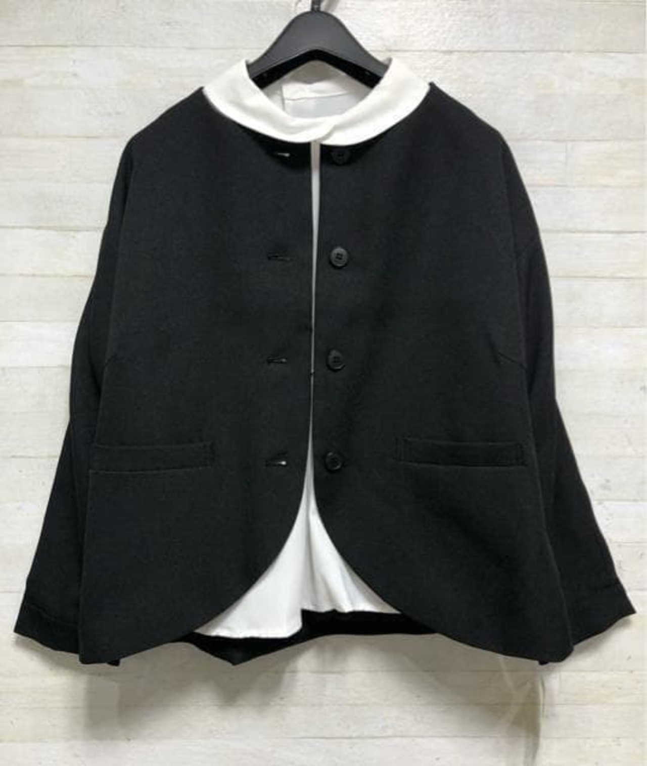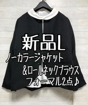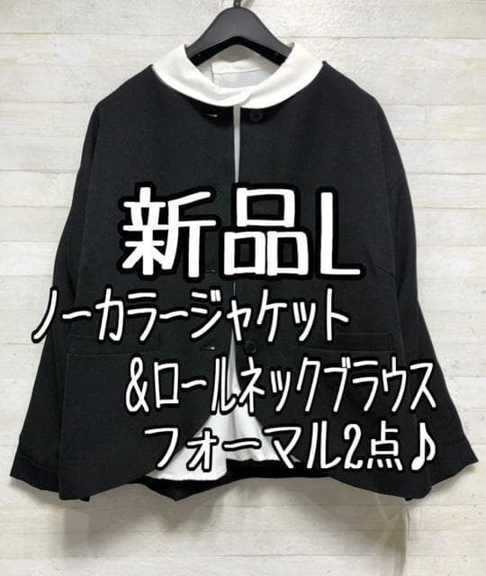 新品☆L♪ナチュラル系ジャケット黒&丸衿ブラウスのセットゆったり☆Q655
