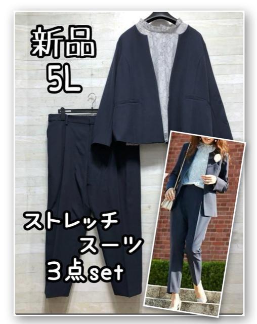 新品☆5L♪紺系ストレッチパンツスーツ3点セットお仕事・フォーマル☆Q665