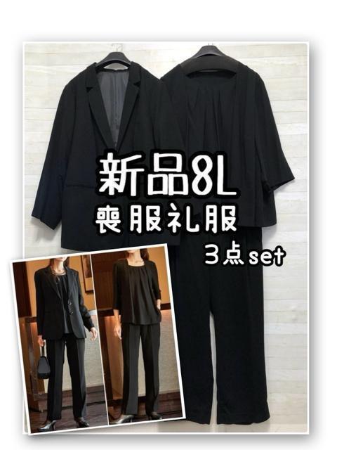 新品☆8L喪服礼服パンツスーツ黒無地ブラックフォーマル3点セット☆R282
