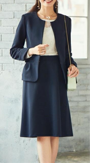 新品☆3L♪紺系♪ストレッチ♪ノーカラーのスカートスーツお仕事にも☆R326