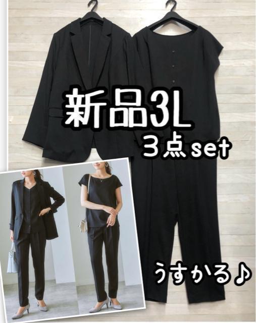 新品☆3L♪黒無地パンツスーツ3点セット♪2WAYブラウス付♪薄手☆R331