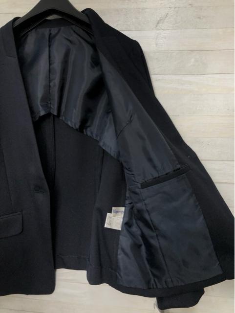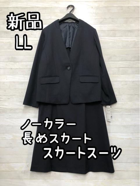 新品☆LLサイズ紺シンプルきれいなノーカラースカートスーツ長めR340