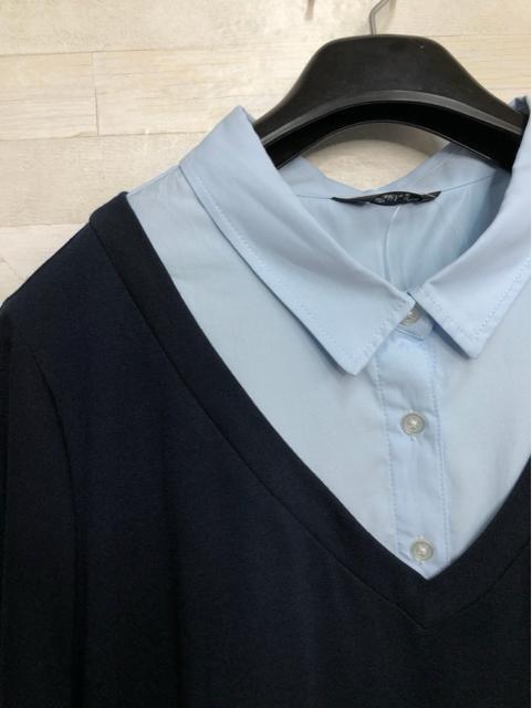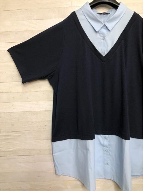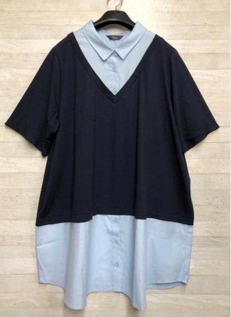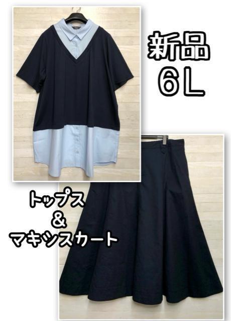 新品☆6L♪紺系♪重ね着風半袖シャツ&マキシ丈フレアスカート♪☆Q673