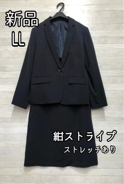 新品☆LLサイズ紺ストライプ♪タイト風スカートスーツ♪ビジネススーツR345