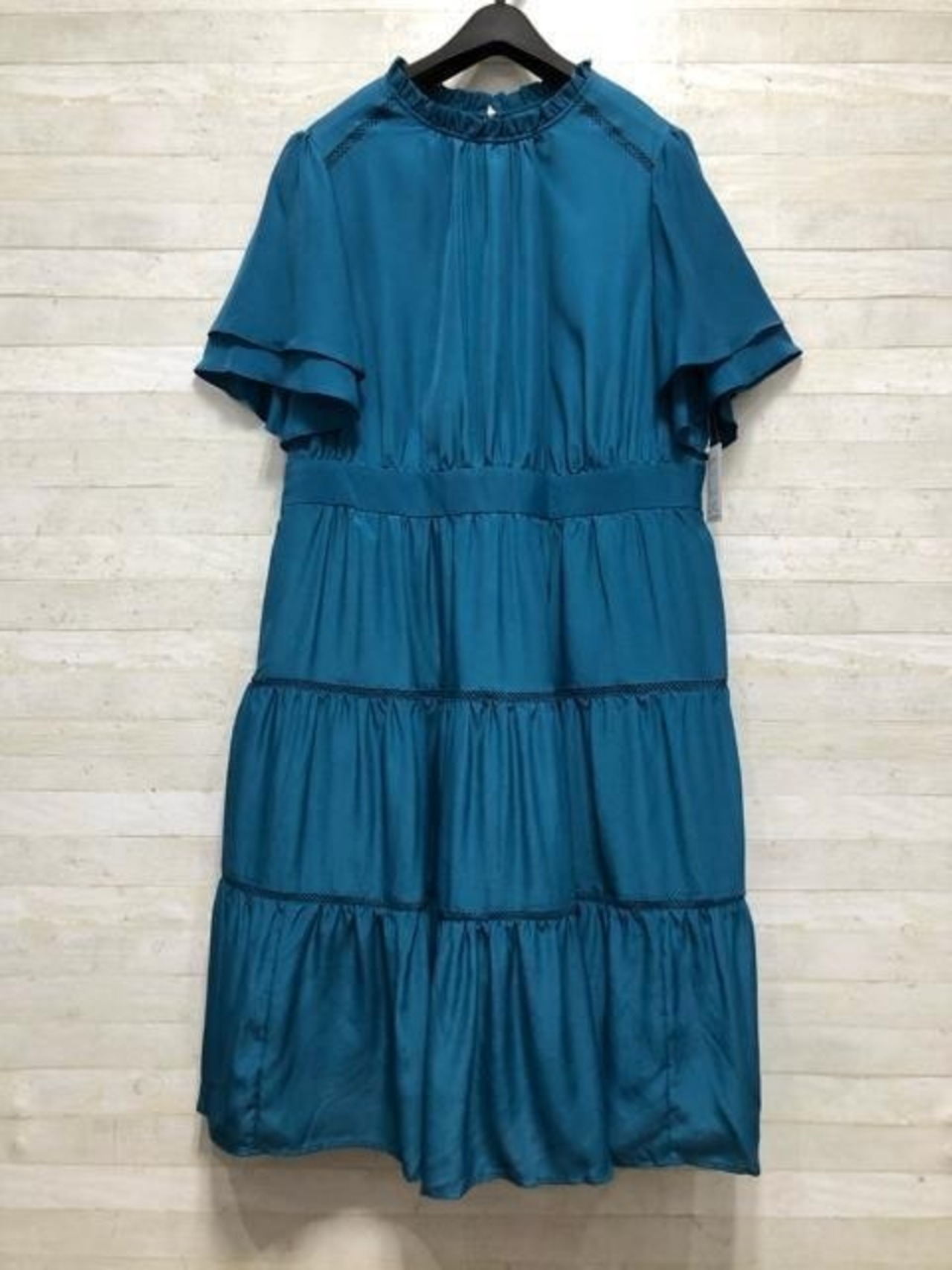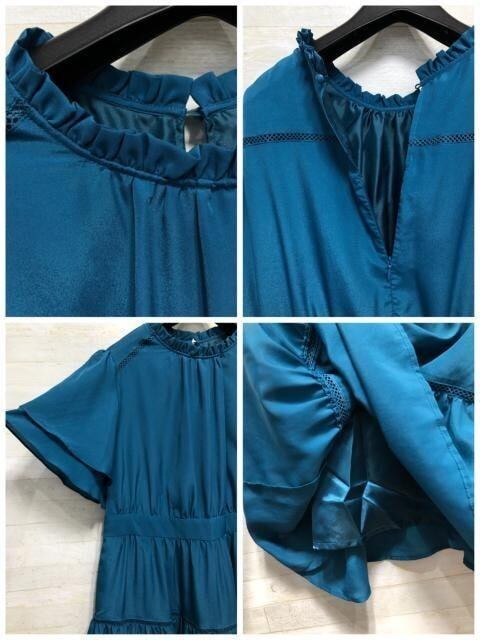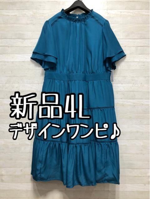 新品☆4Lブルーグリーン系♪フリル衿&ティアード♪デザインワンピ〇A367