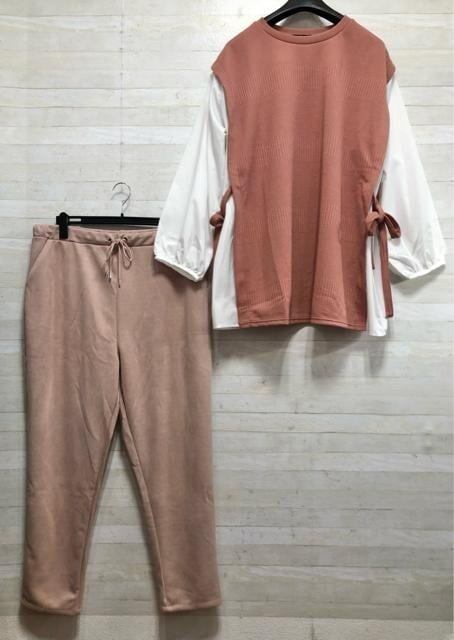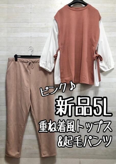 新品☆5Lピンク系♪重ね着風プルオーバー&起毛パンツ〇A516
