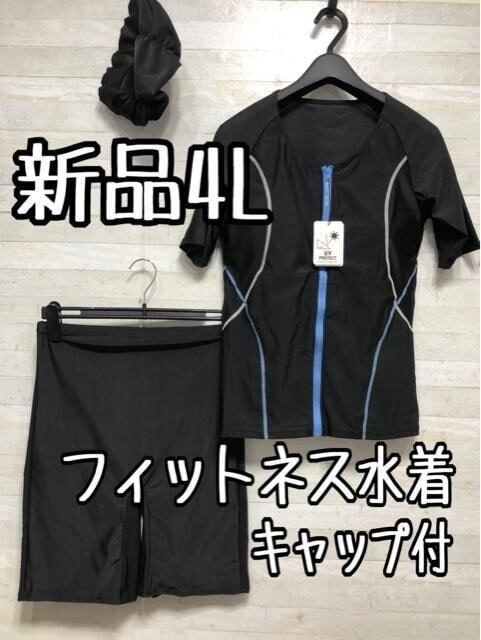 新品☆4L黒系♪前開き着脱楽ちんフィットネス水着上下セット♪UVカット〇A553