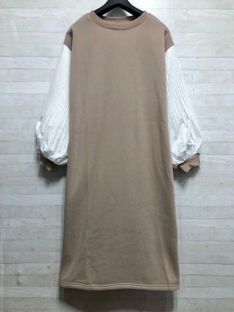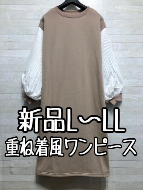 新品☆L~LLくすみカラー♪プリーツ袖おしゃれドッキングワンピ〇B489