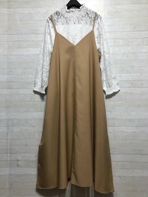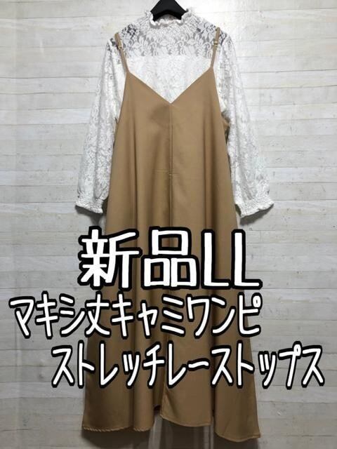 新品☆LL♪ベージュ系キャミワンピ&ストレッチレーストップス〇B590