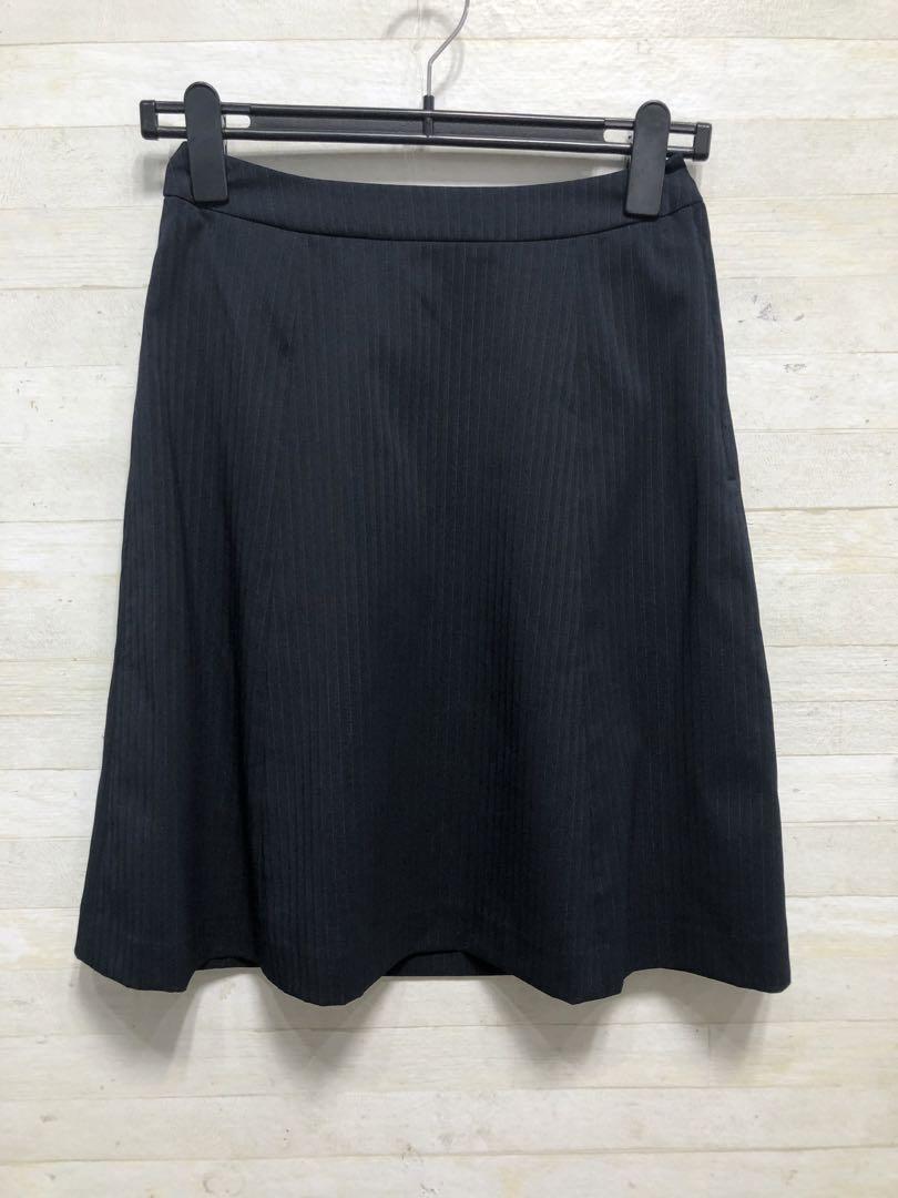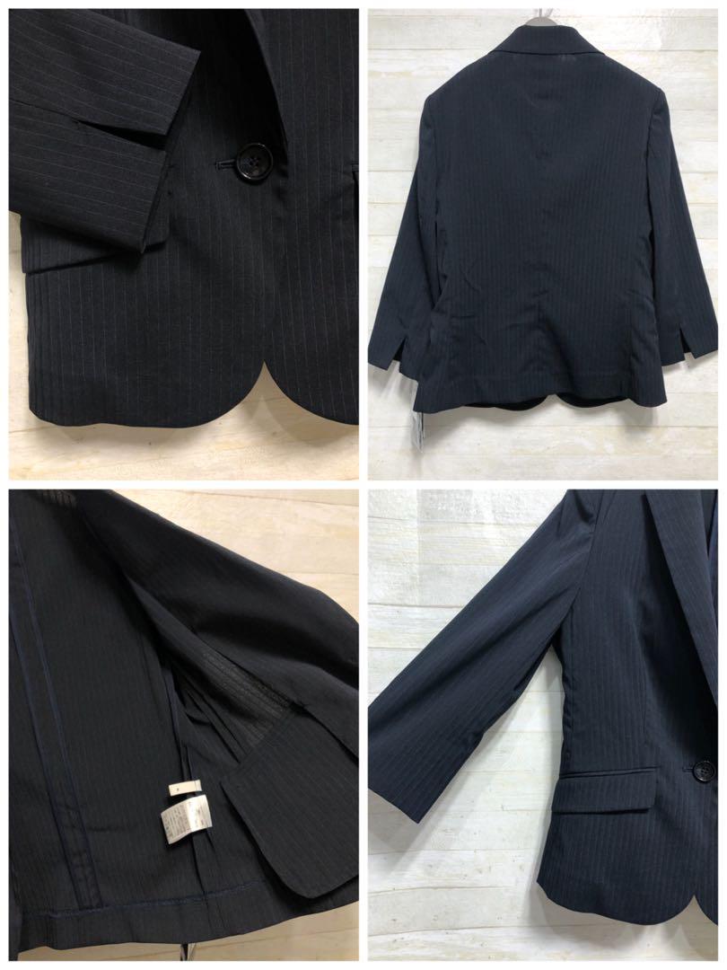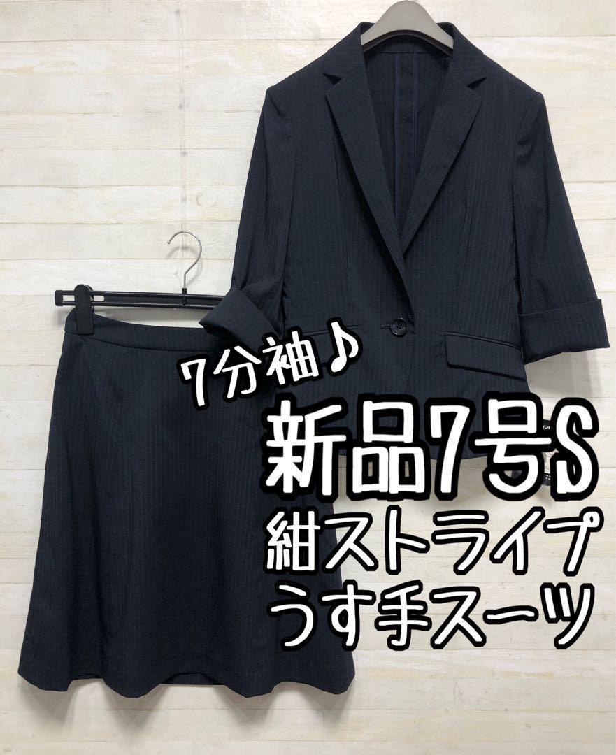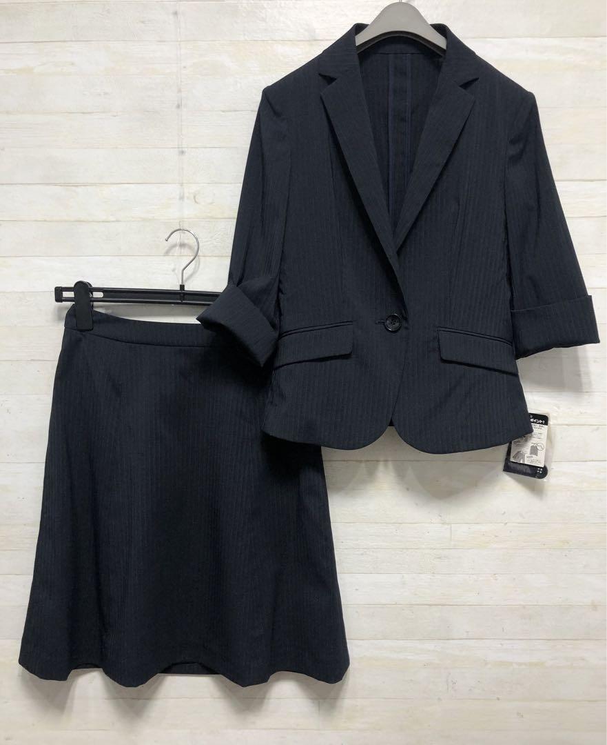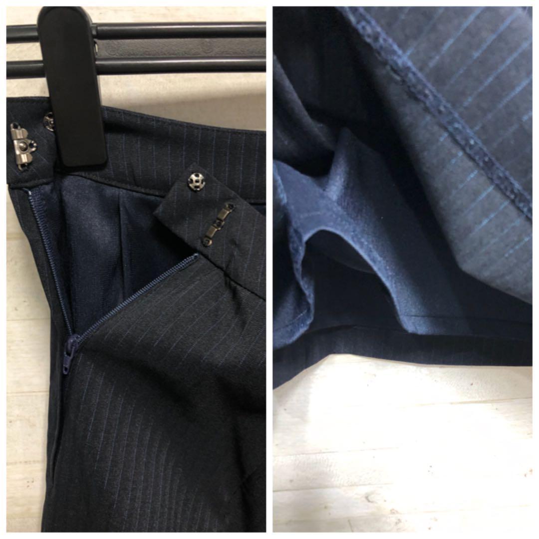 新品☆7号S♪紺系×ストライプ柄のスカートスーツセット♪ストレッチ素材〇G369