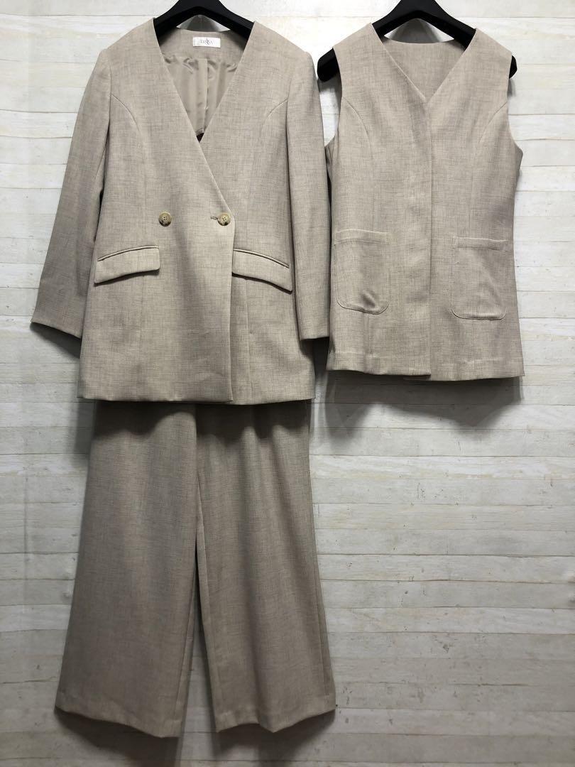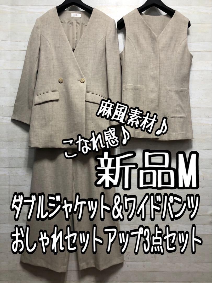 新品☆Mベージュ系♪ストレッチワイドパンツスーツ3点セット◯G287