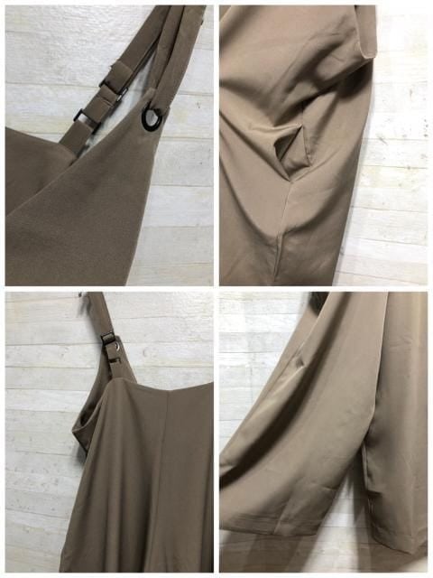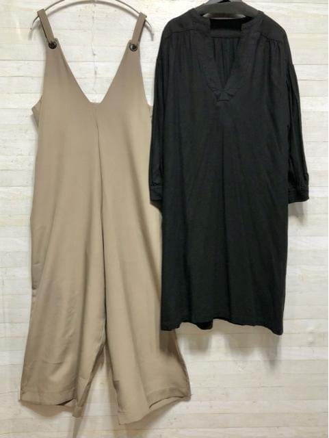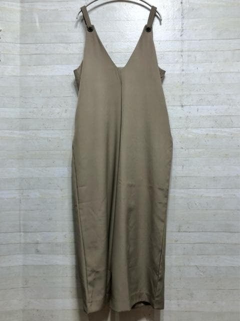 新品☆フリーサイズ♪ベージュ系ワイドサロペット&深Vチュニックワンピ〇A949