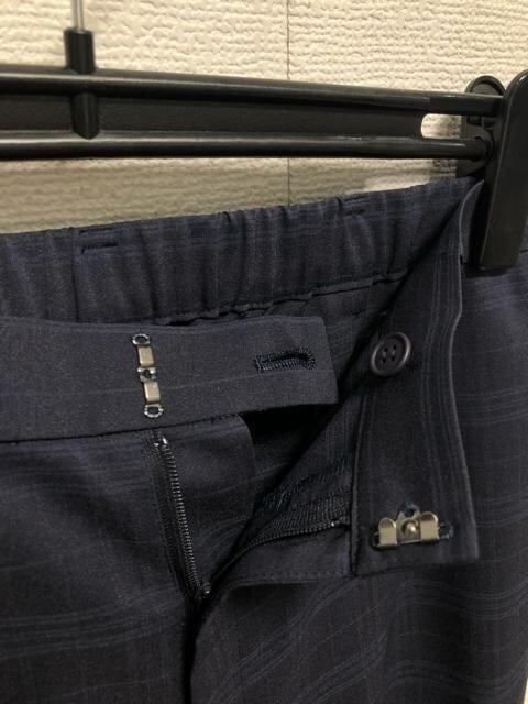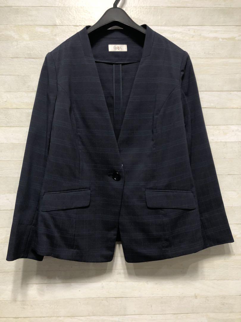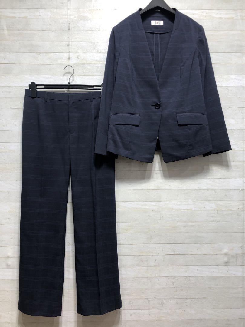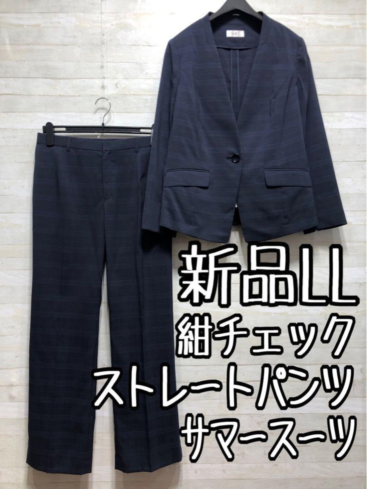 新品☆LL♪紺系サマースーツ♪ノーカラーパンツスーツ♪オフィスわけあり〇D367