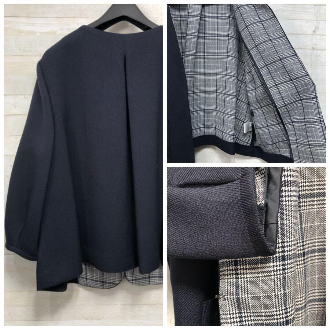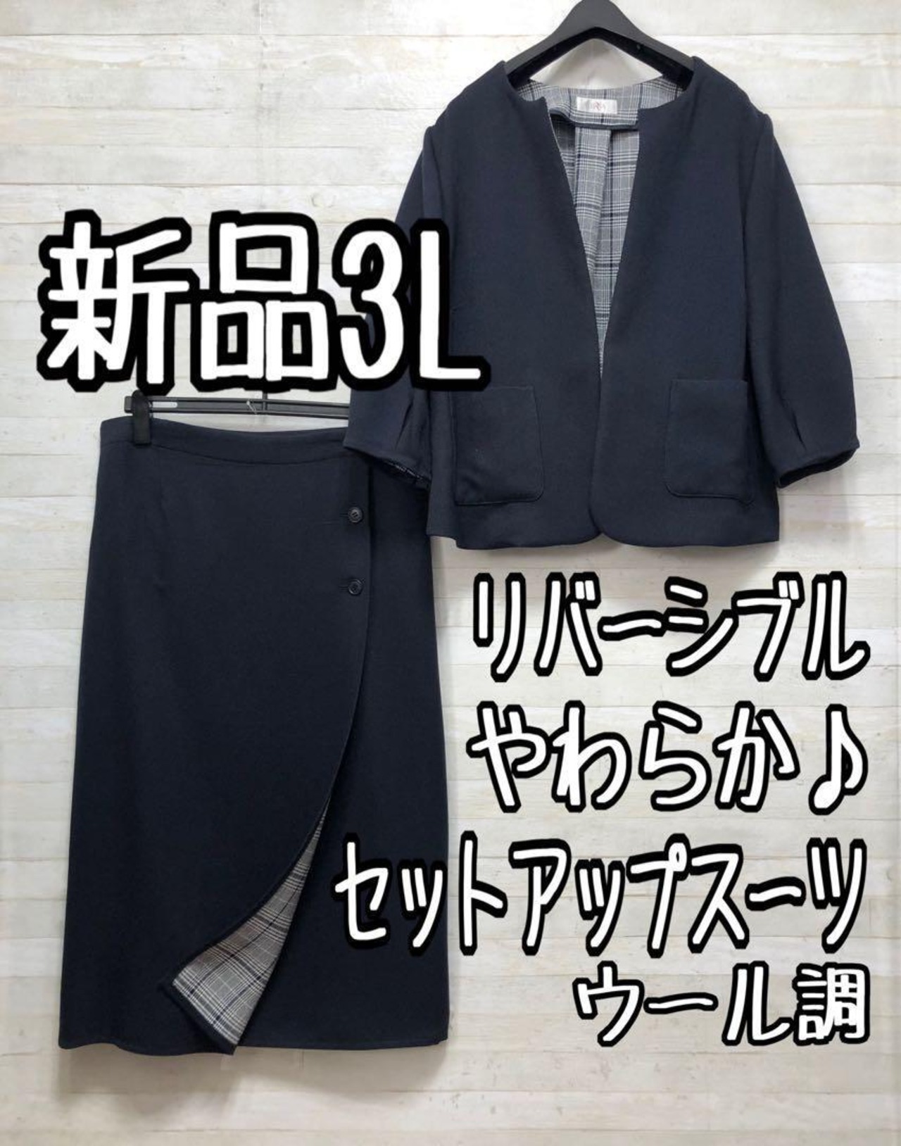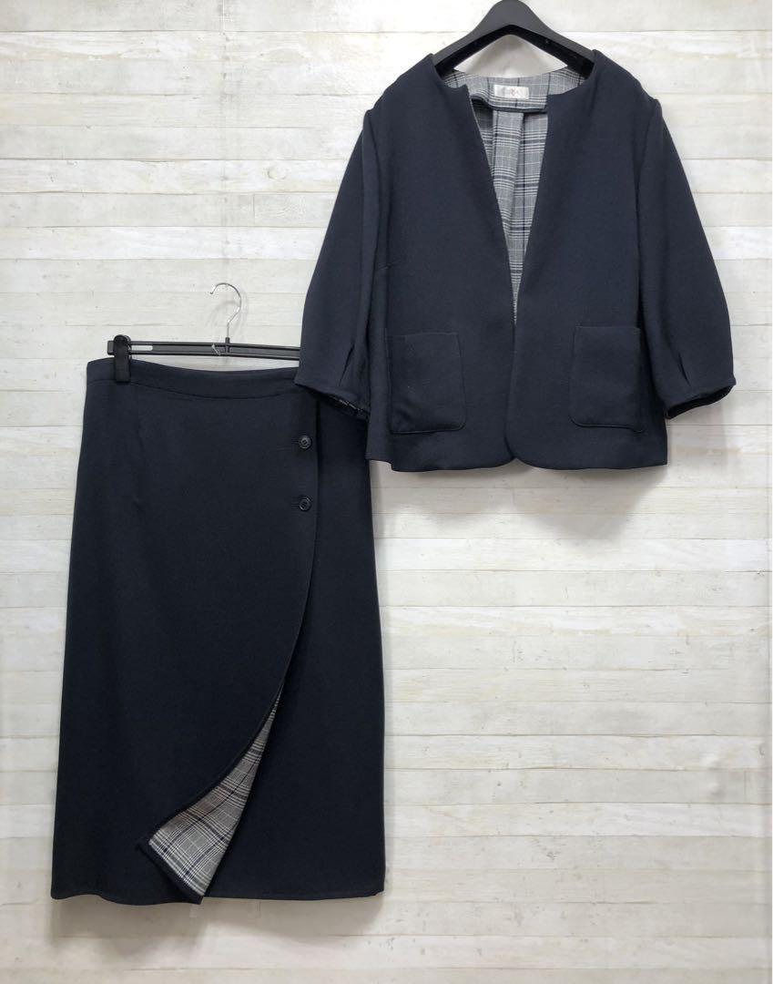 新品☆3L紺×グレー系♪ノーカラー&2wayタイトスカートスーツ〇〇G241
