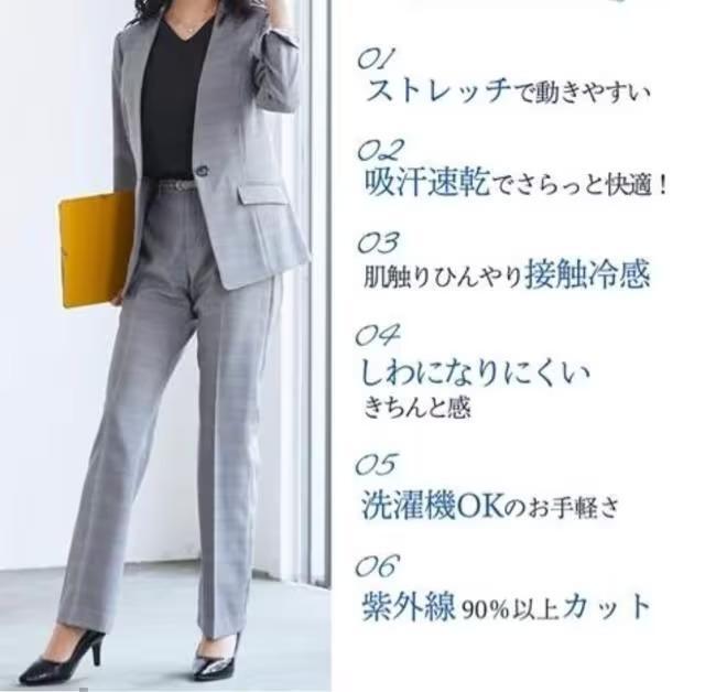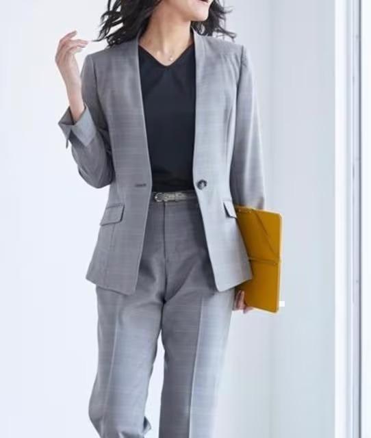 新品☆3L♪グレージュ系サマースーツ♪ノーカラーパンツスーツ♪オフィス◯G302
