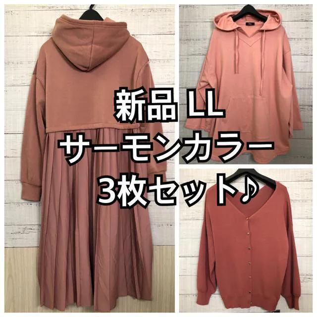 新品☆LL♪サーモンカラーセット♪後ろプリーツパーカーワンピなど☆f997